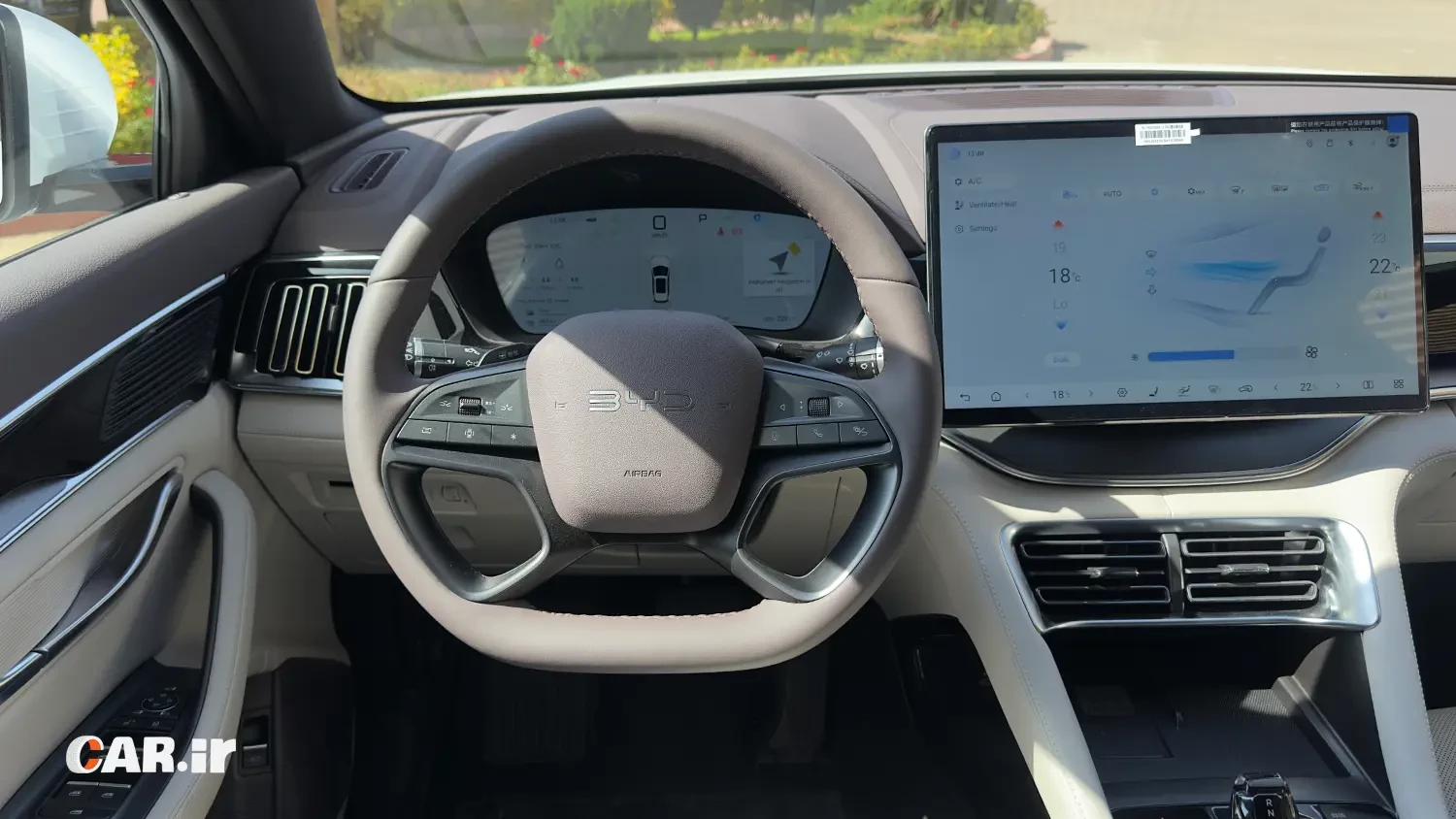کابین بیوایدی سانگ پلاس ترکیبی از طراحی مدرن و کیفیت ساخت بالاست. نمایشگر مالتیمدیای ۱۲.۸ اینچی با قابلیت چرخش به حالت عمودی، از ویژگیهای متمایز این مدل محسوب میشود. با ورود به کابین، کیفیت متریال و دقت در جزئیات بهوضوح حس میشود؛ جایی که بیوایدی از چرم باکیفیت در بخشهای مختلف و پلاستیک نرم و مرغوب استفاده کرده است.