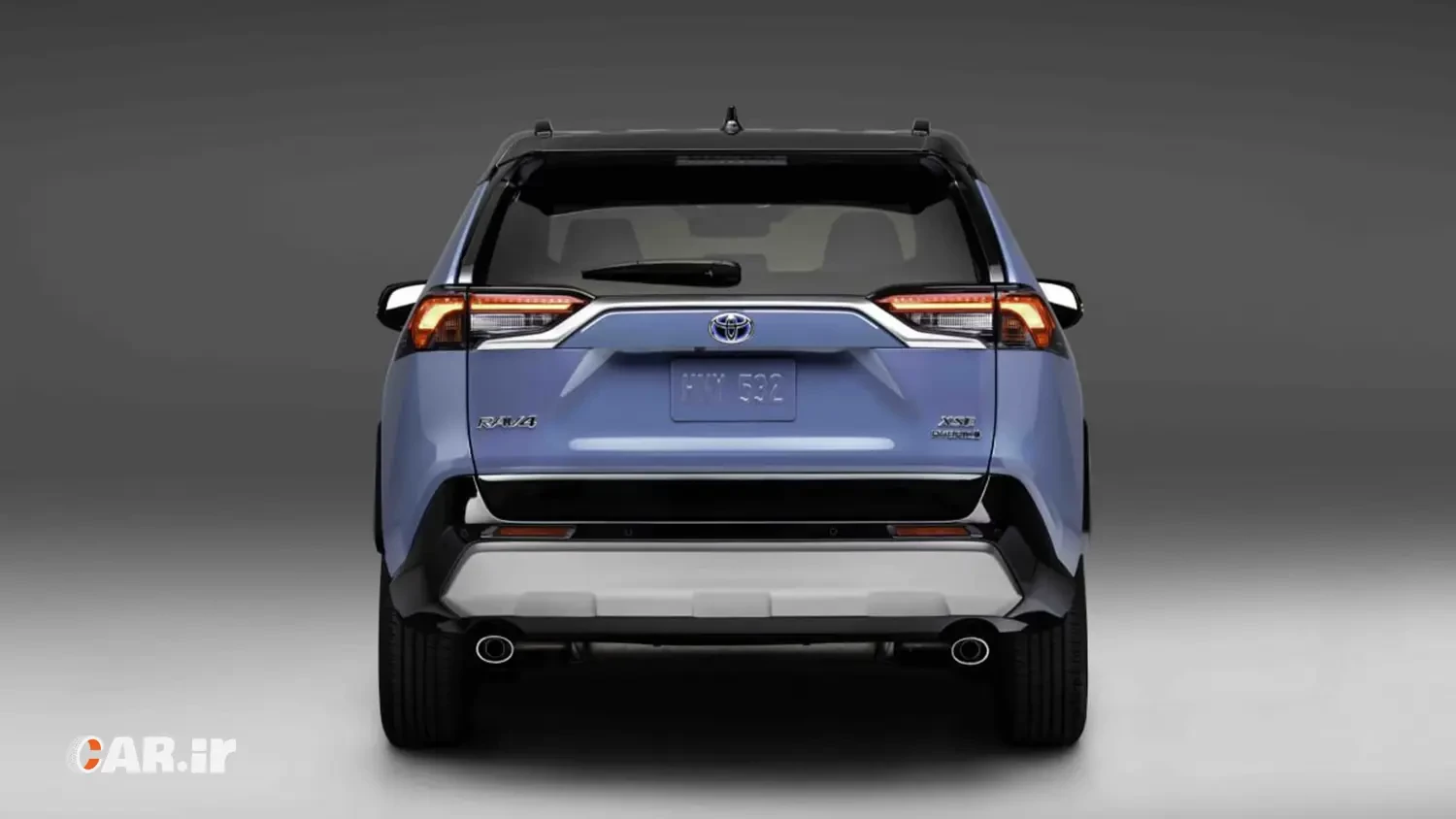 با بررسی نمای عقب این خودرو متوجه هماهنگی بخشهای مختلف آن میشویم، چرا که نمای عقب در عین حال که حس استحکام را منتقل میکند، جذابیت بصری خود را نیز به رخ میکشد. یک اسپویلر سقفی در این نما مشاهده میشود و چراغها به صورت دو تکه، کشیده و با زوایای تیز طراحی شدهاند. فرورفتگیها و برجستگیهای موجود در بخش عقب یک نمای سه بعدی و یک گرافیک مهیج ایجاده کردهاند. سپر عقب نیز عضلانی دیده میشود و از فلاپ مشکی تهیه شده است. طراحی سپر عقب تویوتا راوفور هیبریدی جدید مشابه سپر جلو انجام شده است و هر دو به خوبی حس استحکام را منتقل میکنند.