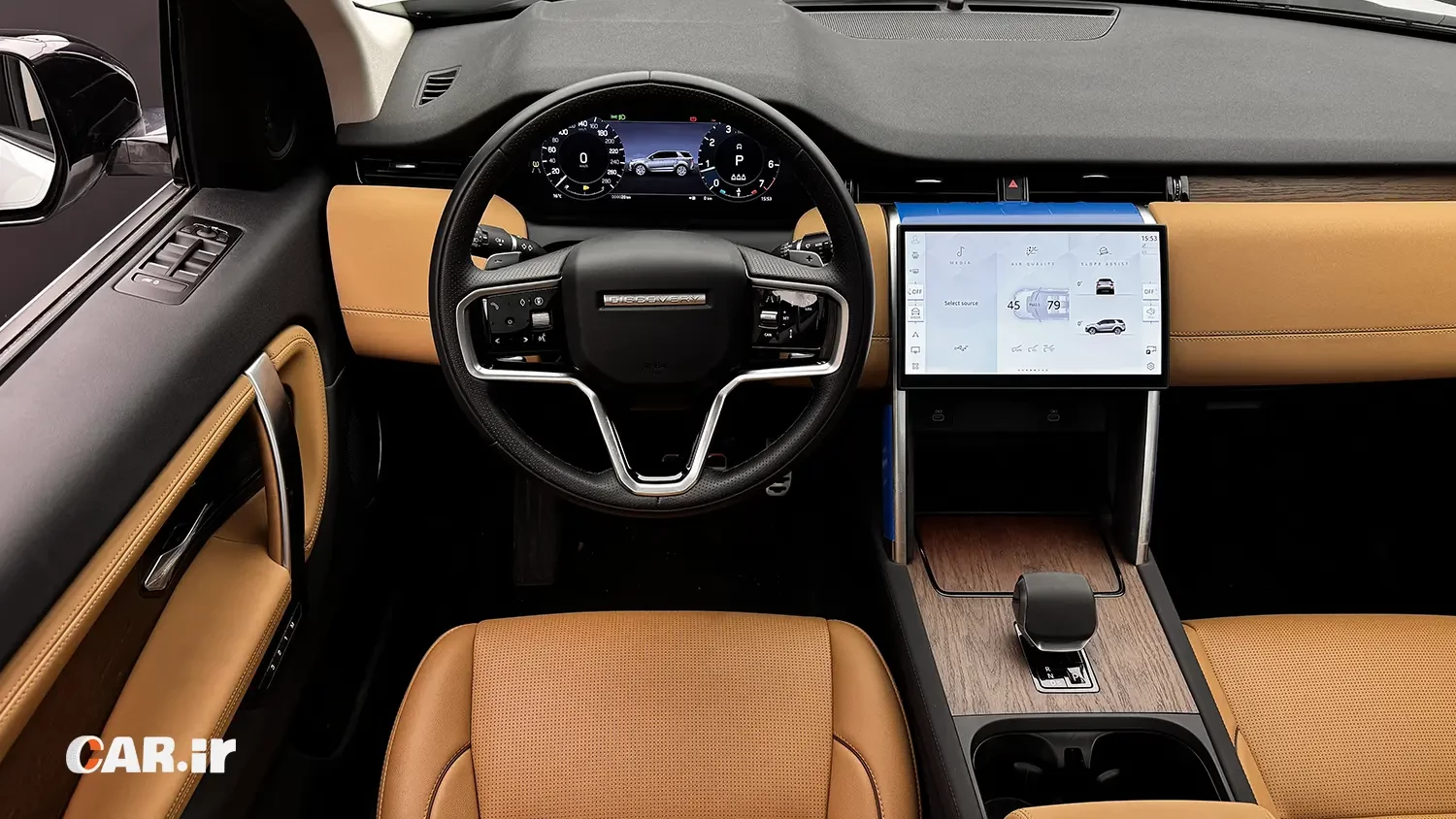 کابین دیسکاوری اسپرت ترکیبی از طراحی کاربردی و لوکسگرایی بریتانیایی است. داشبورد طراحی ساده اما منظم دارد و استفاده از متریال باکیفیت، حس یک خودروی پریمیوم را منتقل میکند. تریمهای چرمی و قطعات فلزی یا طرح آلومینیومی در بخشهای مختلف کابین دیده میشوند که فضای داخلی را شیکتر کردهاند.