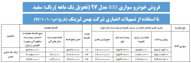 شرایط جدید فروش اقساطی بسترن B30 - دی 97: