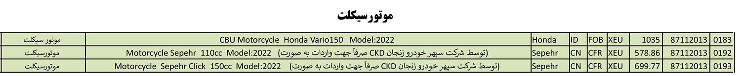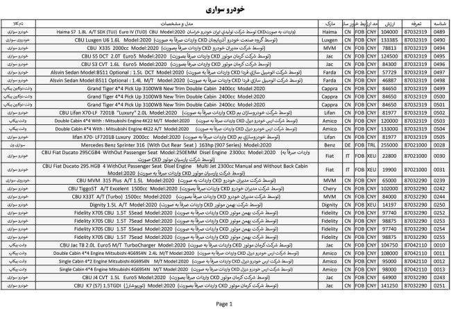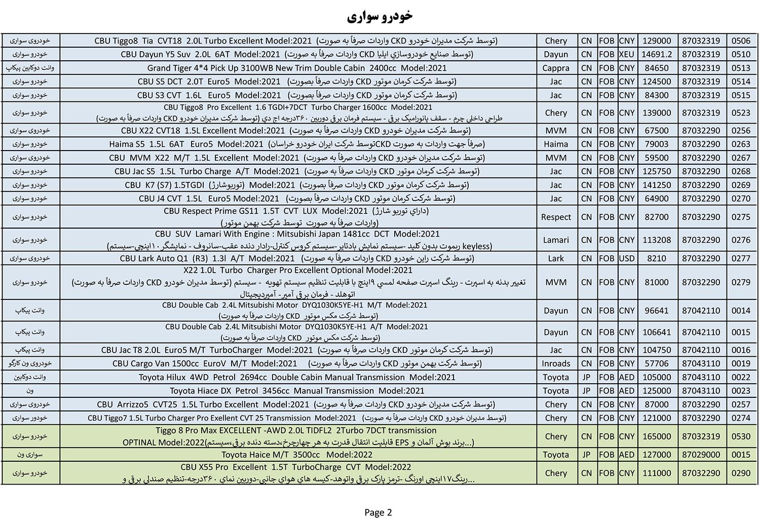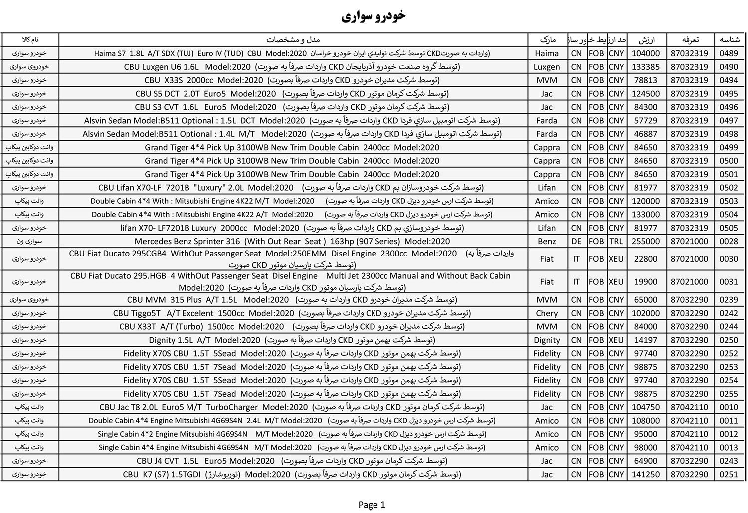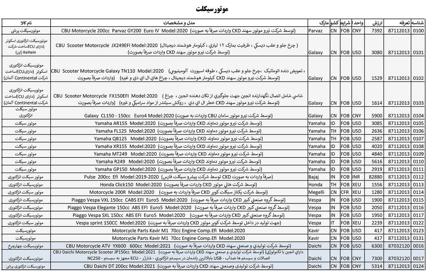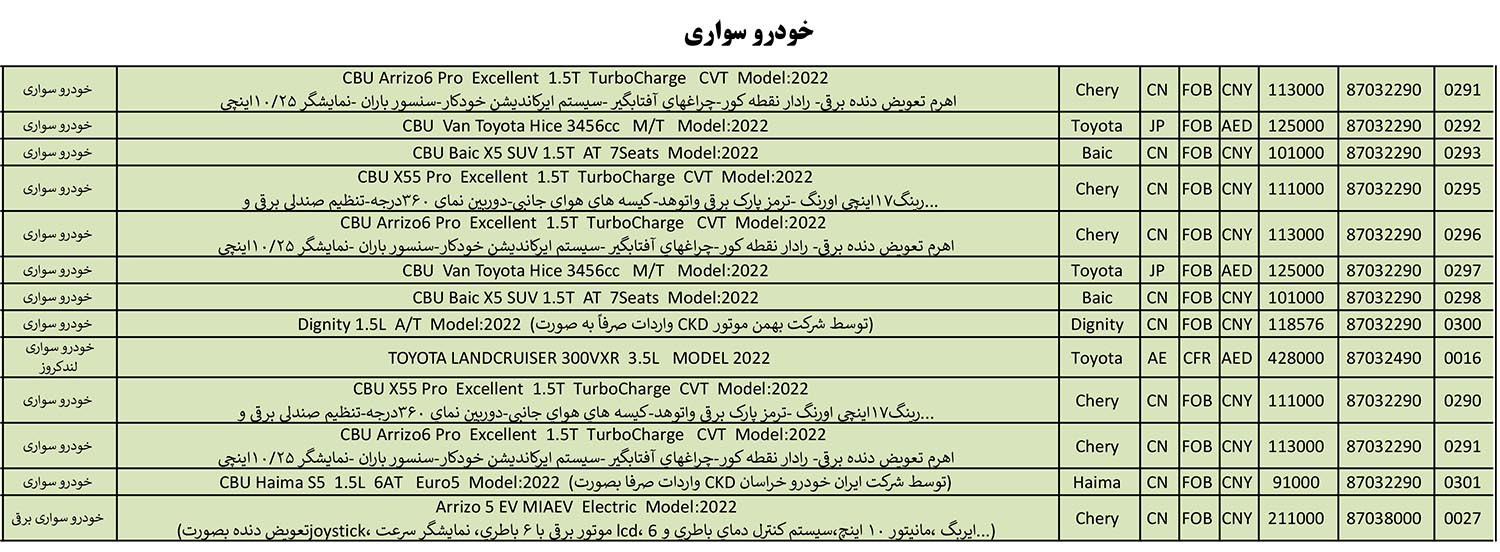 بر این اساس، مدیر کل دفتر ارزش گمرک ایران، در این بخشنامه ارزش مدلهای مختلف خودروهای سواری، کامیون، ماشین آلات راه سازی و موتور سیکلت را به مدیران کل گمرکات اجرایی و ستادی ابلاغ کرد. این بخشنامه که در راستای تبصره 6 قانون خودرو و بر اساس مفاد صورت جلسات 735 لغایت 770 کمیته مشترک گمرک و وزارت صمت تهیه شده، شامل ارزش خودروهای سواری، کامیون، ماشین آلات راه سازی و موتور سیکلت مدل ساخت 2020 و 2021 و 2022 به همراه تعرفه و شناسه ثبت شده در سامانه tsc است.