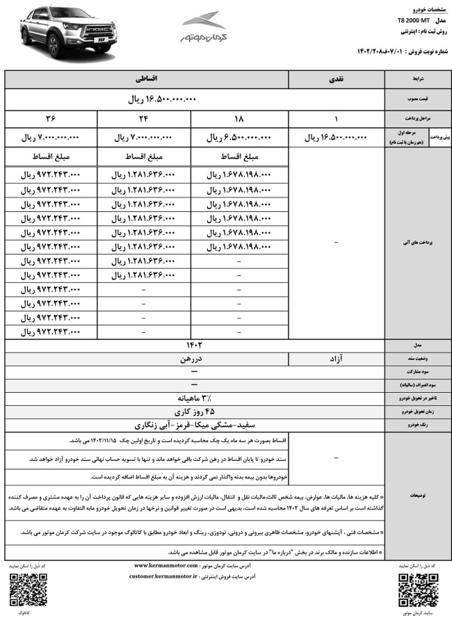 شرایط فروش نقد و اقساط پیکاپ T8 و جک جی۴ ویژه آبان ۱۴۰۲ با موعد تحویل 45 روزه از سوی کرمان موتور اعلام شد.