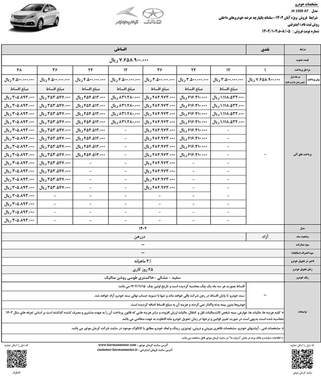 کرمان موتور در این طرح فروش اعتباری قیمت قطعی تی ۸ را یک میلیارد و ۶۵۰ میلیون تومان و قیمت خودرو جی ۴ را ۷۶۵ میلیون و ۸۹۰ هزار تومان تعیین کرده است.