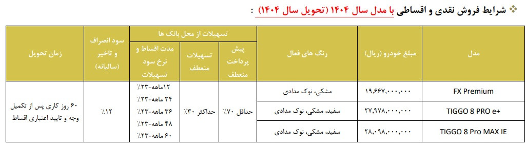 | نام محصول | قیمت (تومان) | پیش پرداخت | تسهیلات منعطف |
