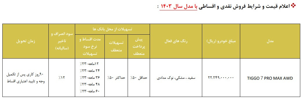 | تیگو 7 پرومکس دو دیفرانسیل | 2,224,900,000 | حداقل 50% | حداکثر 50% |
