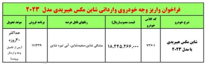 | شاین مکس هیبریدی | 2023 | 72601 | 1,824,526,600 | مشکی شاین، سفید شاین و آبی تیره شاین | حداکثر 30 روز |