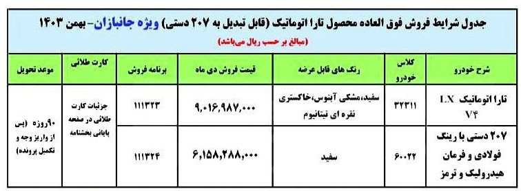 بر اساس اطلاعیه منتشر شده، ثبتنام اولیه برای تمامی متقاضیان خودروی تارا اتوماتیک در نظر گرفته شده، اما در صورت تمایل، امکان تبدیل آن به پژو ۲۰۷ دستی نیز وجود دارد.