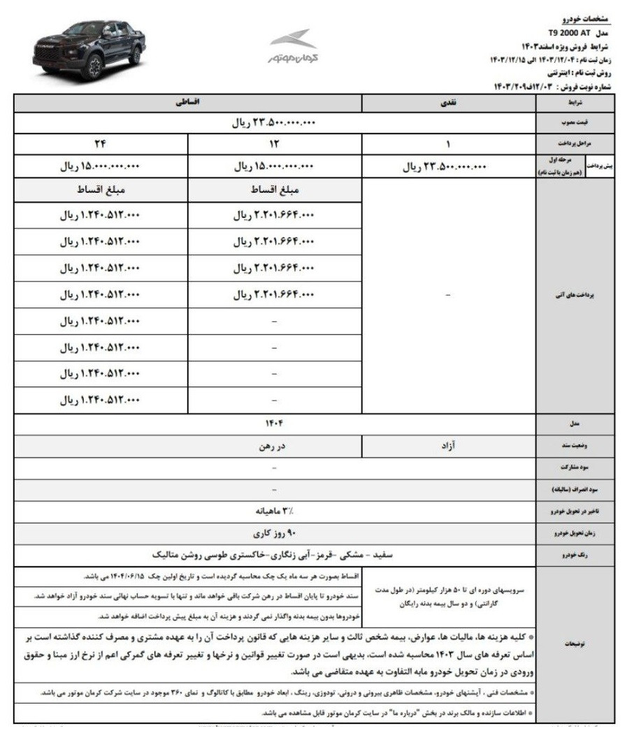 شرکت کرمان موتور شرایط فروش نقدی و اقساطی خودروی KMC T9 را با مدل 1404 اعلام کرد. این طرح بهصورت اینترنتی اجرا شده و موعد تحویل آن ۹۰ روز کاری خواهد بود. همچنین در صورت تأخیر در تحویل، جریمهای معادل ۳ درصد ماهیانه در نظر گرفته شده است.