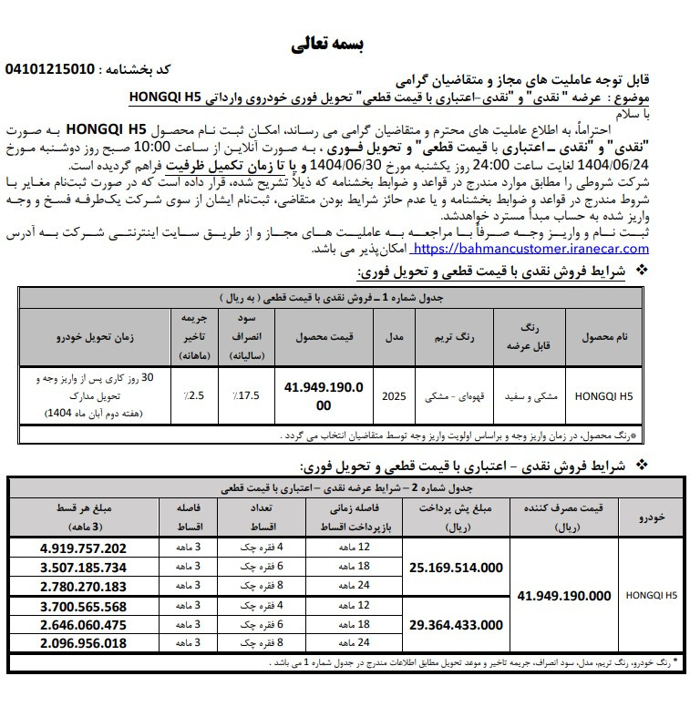 شرکت بهمن موتور شرایط فروش سدان لوکس هونگچی H5 مدل 2025 را اعلام کرد. این طرح فروش از ساعت ۱۰ صبح امروز دوشنبه ۲۴ شهریورماه ۱۴۰۴ آغاز شده و تا ساعت ۲۴ روز یکشنبه ۳۰ شهریورماه ۱۴۰۴ یا تا تکمیل ظرفیت ادامه خواهد داشت. ثبتنام تنها بهصورت آنلاین انجام میشود و در صورت مغایرت اطلاعات ثبتنام با ضوابط بخشنامه، قرارداد بهصورت یکطرفه فسخ خواهد شد و وجه پرداختی به متقاضی بازگردانده میشود.