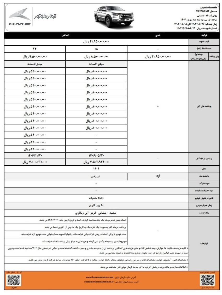 شرکت کرمان موتور شرایط جدید فروش نقد و اقساط پیکاپ کی ام سی T8 را اعلام کرد. بر اساس اطلاعیه منتشرشده، این طرح از ساعت ۸ صبح روز چهارشنبه ۲۶ شهریورماه ۱۴۰۴ بهصورت اینترنتی آغاز خواهد شد.