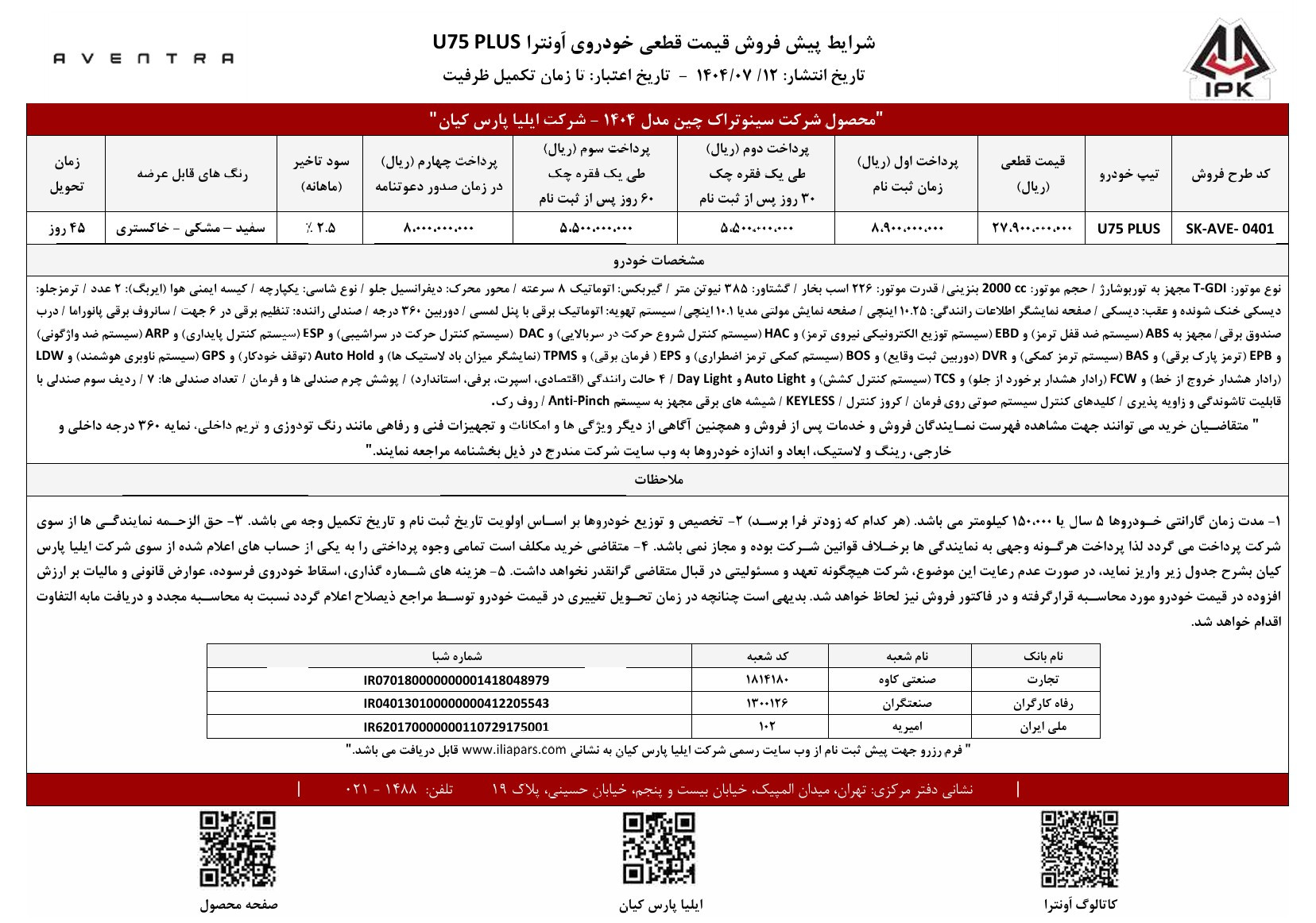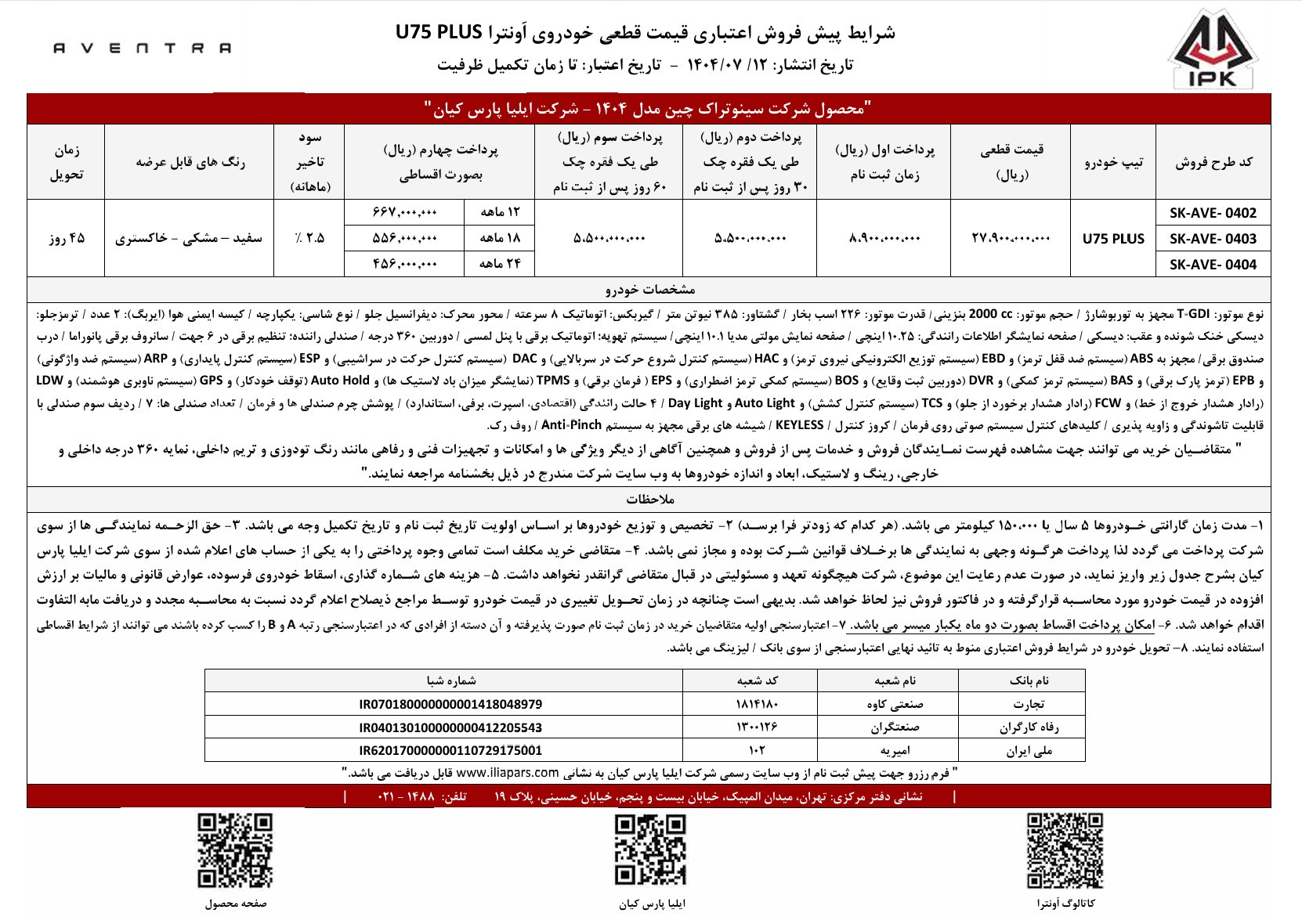 عقیل مصطفایی، معاون بازاریابی و فروش صنایع خودروسازی ایلیا اعلام کرد: اولین مرحله پیش فروش نقدی و اعتباری اونترا U75 Plus با قیمت قطعی از روز ۱۲ مهرماه آغاز خواهد شد.