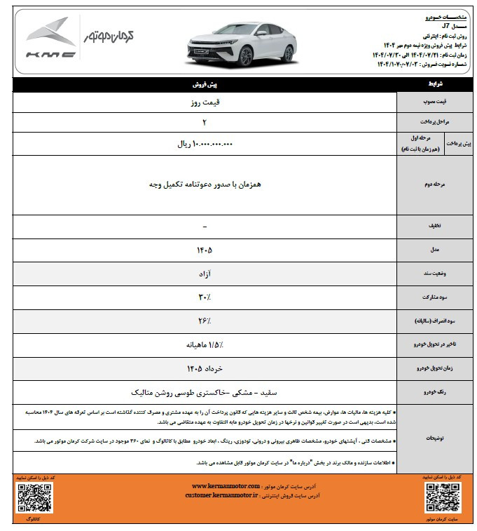 شرکت کرمان موتور از آغاز طرح پیشفروش دو مرحلهای خودرو کیامسی j7 خبر داد. بر اساس اعلام این شرکت، موعد تحویل خرداد ۱۴۰۵ در نظر گرفته شده است.