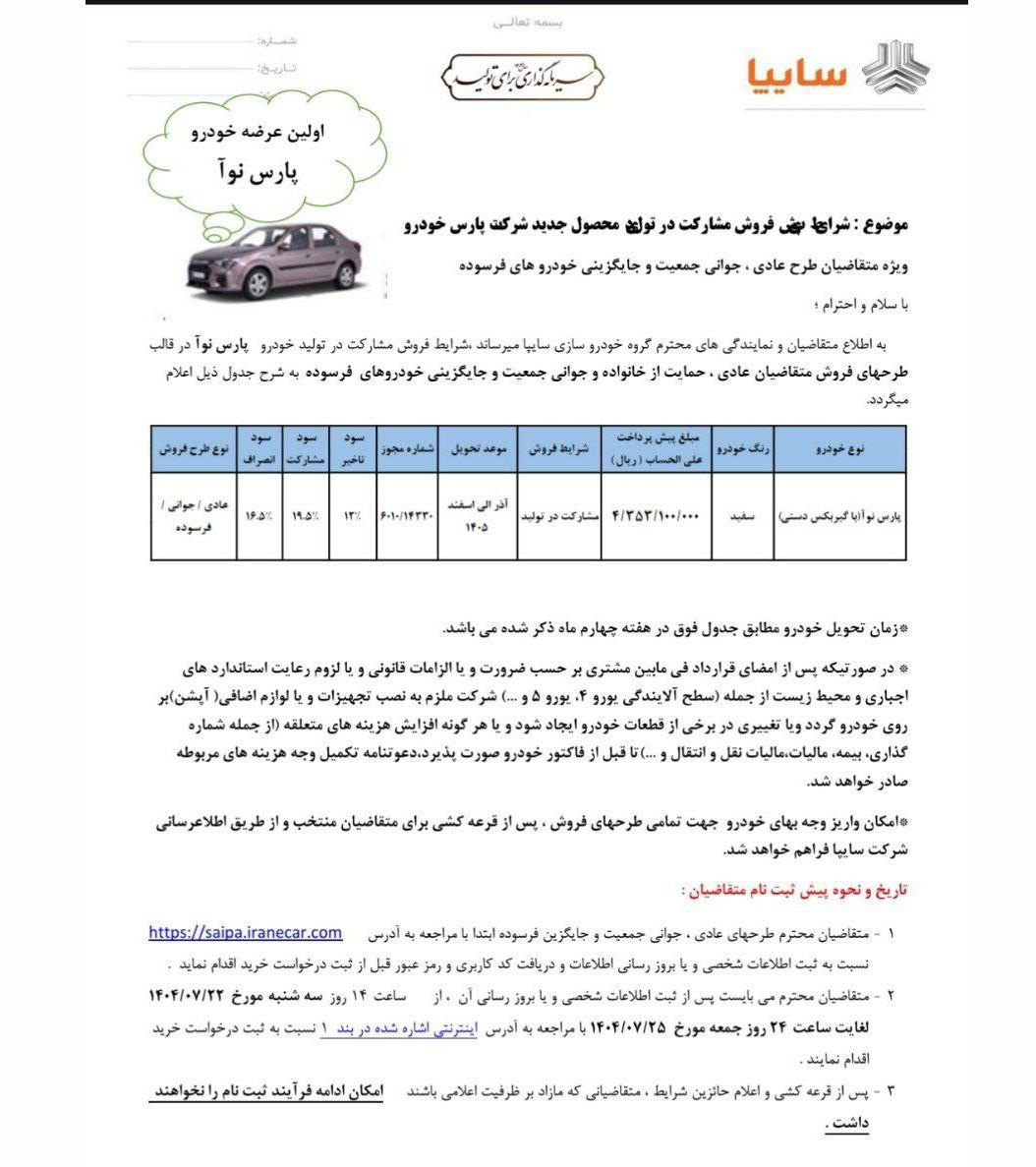 شرکت پارسخودرو از آغاز طرح فروش خودروی جدید پارس نوآ خبر داد.