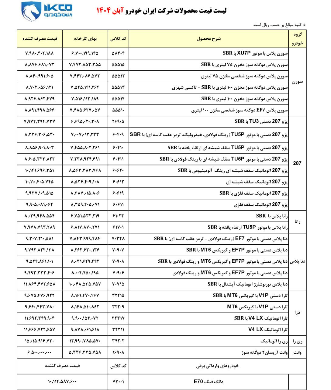 شرکت ایرانخودرو امروز، شنبه ۳ آبانماه ۱۴۰۴، فهرست جدید قیمت محصولات خود را ویژه این ماه منتشر کرد. بر اساس اعلام رسمی این شرکت، قیمتها برای محصولات تولیدی آبانماه بهروزرسانی شده و مبنای فروش در طرحهای جاری و آتی قرار خواهند گرفت.