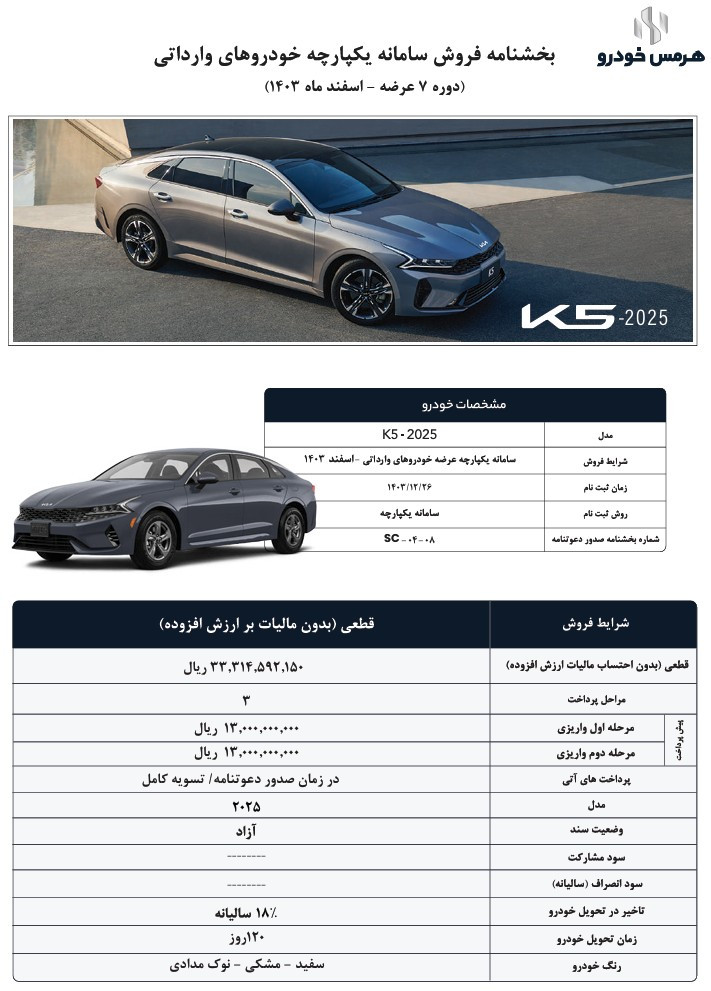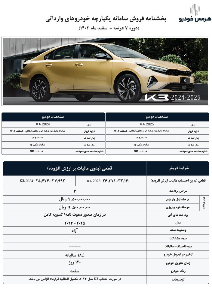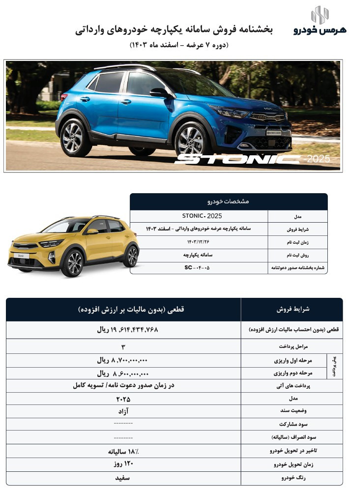 بخشنامه فروش محصولات هرمس خودرو ویژه منتخبین مرحله هفتم سامانه یکپارچه وارداتی(اسفندماه 1404) منتشر شد و براساس آن، متقاضیانی که در این دوره بهعنوان برنده نهایی انتخاب شدهاند، میتوانند برای تکمیل مراحل خرید خودرو اقدام کنند. در این بخشنامه چهار محصول وارداتی عرضه میشود که شامل کیا استونیک، کیا K3، کیا K5 و هیوندای سوناتا است.