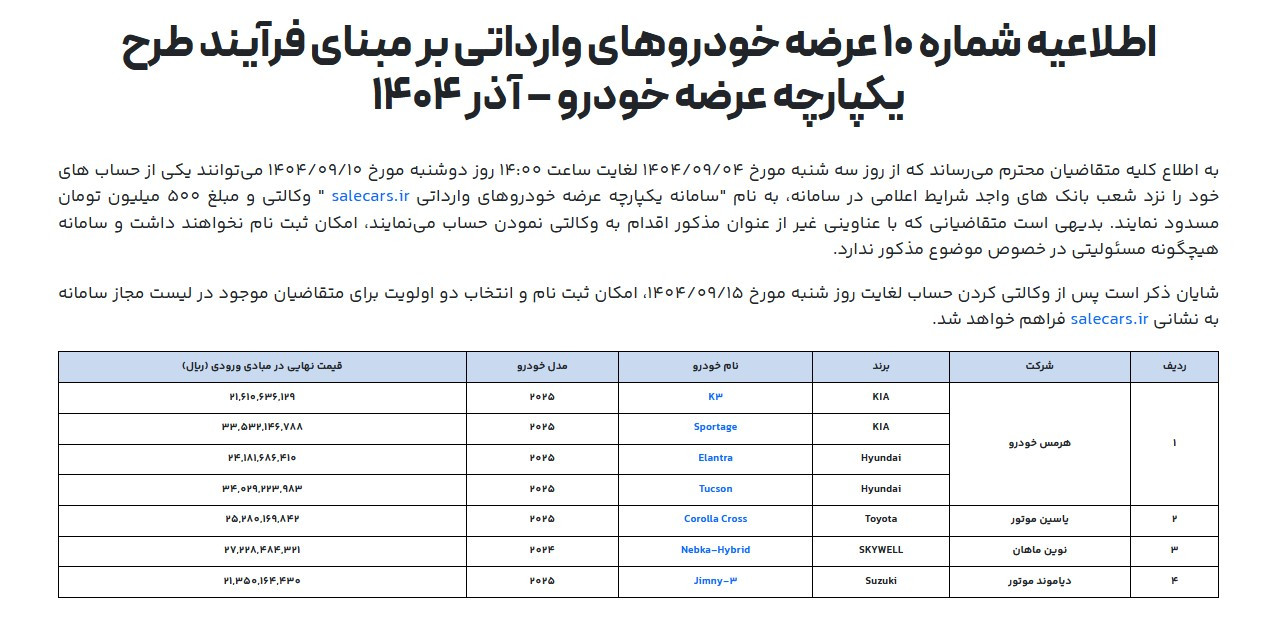 سامانه یکپارچه عرضه خودروهای وارداتی از آغاز مرحله جدید ثبتنام برای متقاضیان خبر داد. بر اساس اطلاعیه منتشرشده، متقاضیان میتوانند از روز سهشنبه ۴ آذر ۱۴۰۴ تا پایان روز شنبه 15 آذر ۱۴۰۴ با مراجعه به نشانی salecars.ir نسبت به ثبتنام اقدام کنند.