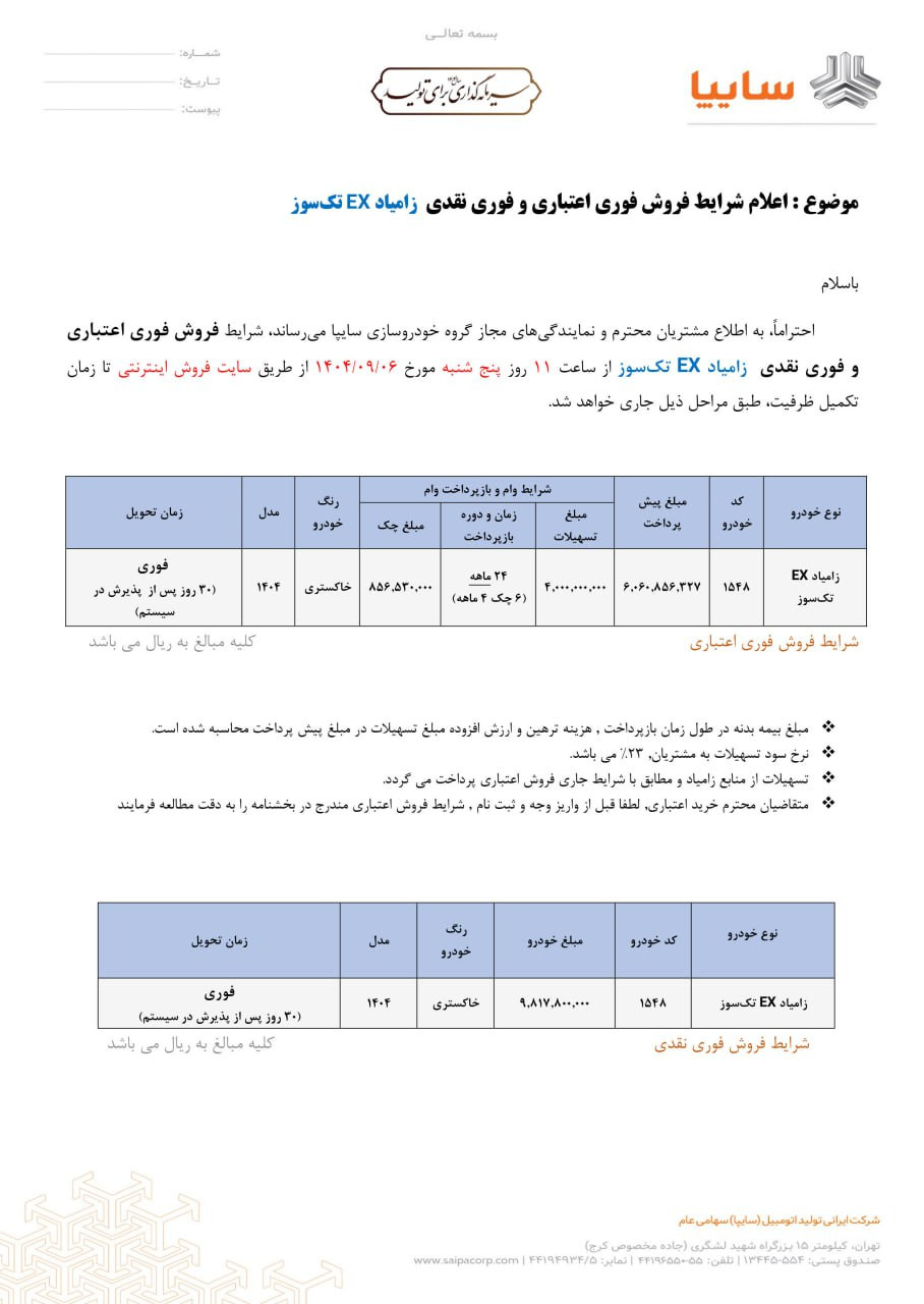 زامیاد طرح جدید فروش فوری وانت نیسان ارتقایافته زامیاد EX تکسوز را اعلام کرد. این مرحله از فروش بهصورت نقدی و اعتباری انجام میشود و طبق اعلام شرکت، ثبتنام از ساعت 11 صبح روز پنجشنبه 6 آذرماه ۱۴۰۴ از طریق سامانه فروش اینترنتی سایپا آغاز خواهد شد و تا زمان تکمیل ظرفیت ادامه دارد.