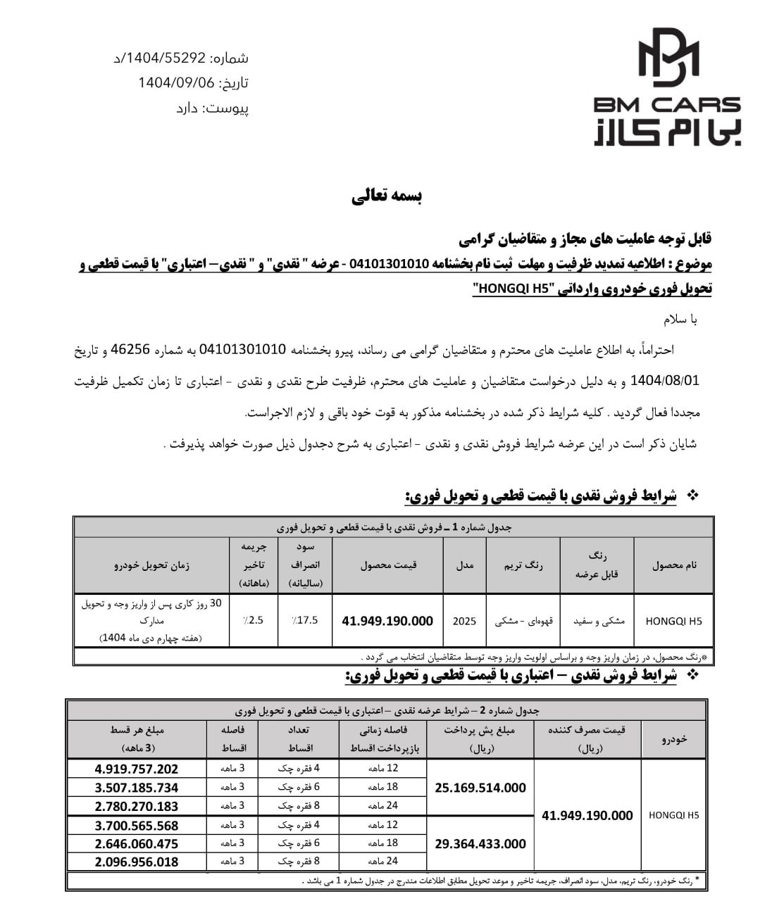 شرکت بیامکارز با صدور بخشنامهای از آغاز مرحله جدید فروش خودروی هونگچی H5 مدل ۲۰۲۵ در دو قالب فروش نقدی و فروش نقدی- اعتباری با قیمت قطعی و تحویل فوری خبر داد. این طرح از امروز شنبه 8 آذرماه آغاز شده و تا زمان تکمیل ظرفیت ادامه دارد، ثبتنام از طریق عاملیتهای مجاز شرکت بیامکارز انجام میشود.