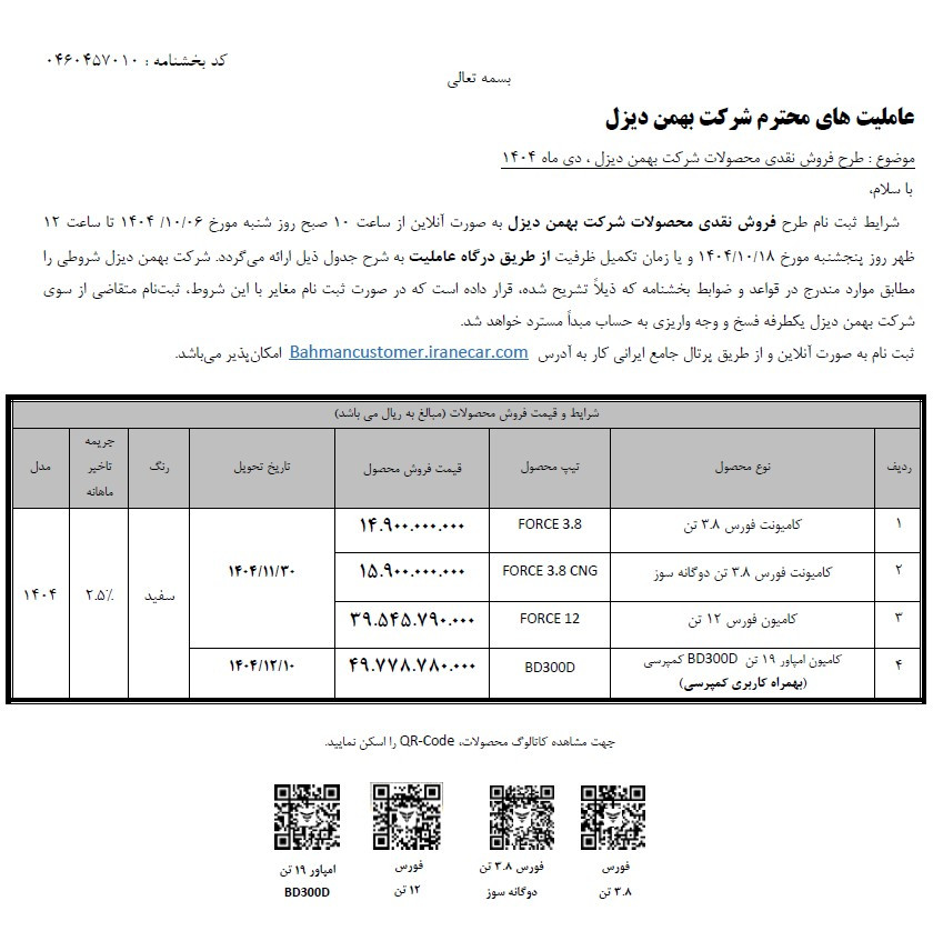 - کامیون فورس 12 تن با قیمت حدود سه میلیارد 954 میلیون تومان با تحویل پایان بهمن 1404