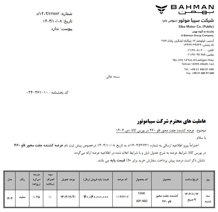 بر اساس اعلام رسمی بورس کالای ایران، شرکت سیبا موتور در نظر دارد کشنده جفت محور فاو J6P-460 را روز ۱۶ دیماه ۱۴۰۴ در معاملات بورس کالا عرضه کند.
