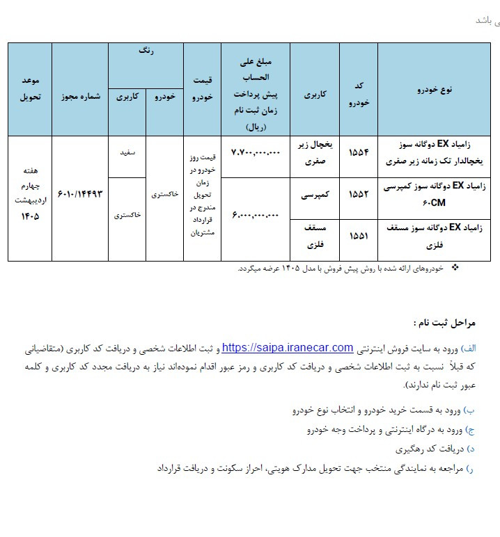 متقاضیان میتوانند با مراجعه به سامانه فروش اینترنتی سایپا به آذرس https://saipa.iranecar.com نسبت به ثبتنام و خرید خودرو اقدام کنند.