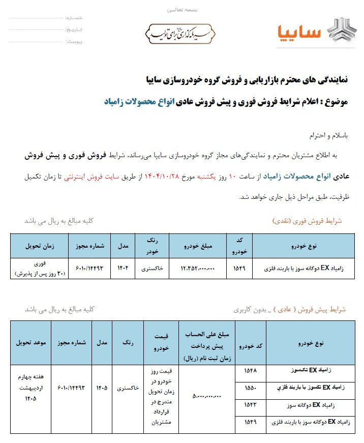 شرکت زامیاد از روز یکشنبه ۲8 دیماه ۱۴۰۴ طرح فروش فوری و پیش فروش محصولات خود را از طریق سایت فروش اینترنتی سایپا آغاز میکند. این طرح تا زمان تکمیل ظرفیت ادامه خواهد داشت.