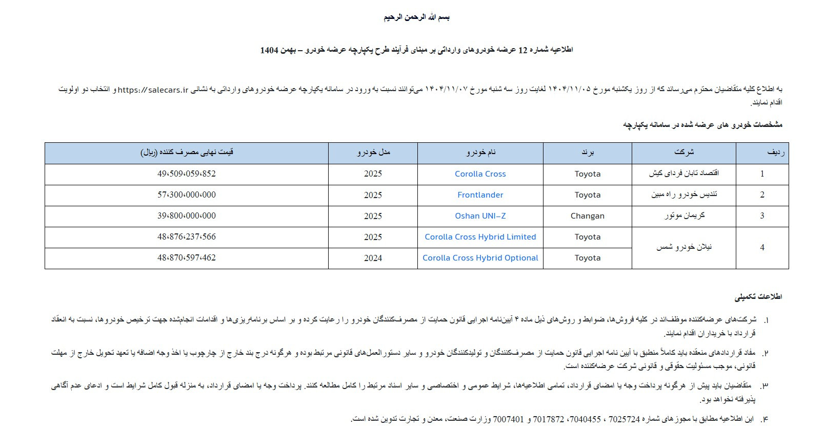 در ادامه روند عرضه خودروهای وارداتی، اطلاعیه شماره ۱۲ طرح یکپارچه عرضه خودروهای وارداتی ویژه بهمنماه ۱۴۰۴ منتشر شد. بر اساس این اطلاعیه، متقاضیان میتوانند از روز چهارشنبه ۱ بهمن ۱۴۰۴ تا پایان روز جمعه ۳ بهمن ۱۴۰۴ با مراجعه به سامانه یکپارچه عرضه خودروهای وارداتی به نشانی salecars.ir، نسبت به ثبتنام و انتخاب دو اولویت خرید از میان خودروهای اعلامشده اقدام کنند.