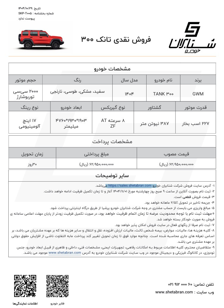 شرکت شتابران خودرو شرایط فروش فوری نقدی کراس اوور آفرودی تانک 300 را با قیمت قطعی اعلام کرد. بر اساس اطلاعیه منتشرشده، این طرح از ساعت ۹ صبح روز چهارشنبه ۱ بهمنماه فعال خواهد شد و ثبتنام بهصورت اینترنتی انجام میشود.