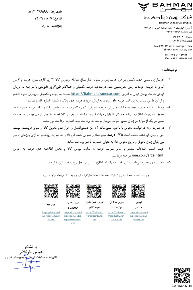 شرکت بهمن دیزل شرایط عرضه جدید محصولات تجاری خود را در بورس کالا اعلام کرد. بر اساس این بخشنامه، مجموعهای از کامیونتها، کامیونها و کشندههای بهمن دیزل در بهمنماه ۱۴۰۴ و در قالب عرضه در بورس کالا در دسترس متقاضیان قرار میگیرند. تمامی این محصولات با شرایط تحویل فوری یکماهه عرضه خواهند شد.