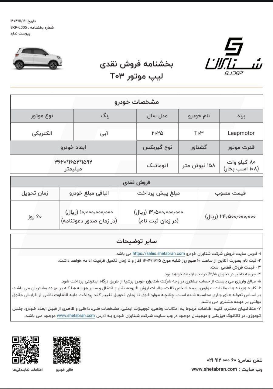 شرایط جدید پیشفروش خودروی لیپموتور T03 ویژه بهمنماه 1404 از ساعت 10 صبح روز شنبه 25 بهمن ماه با قیمت جدید در نمایندگیهای فروش شرکت Leapmotor آغاز خواهد شد.