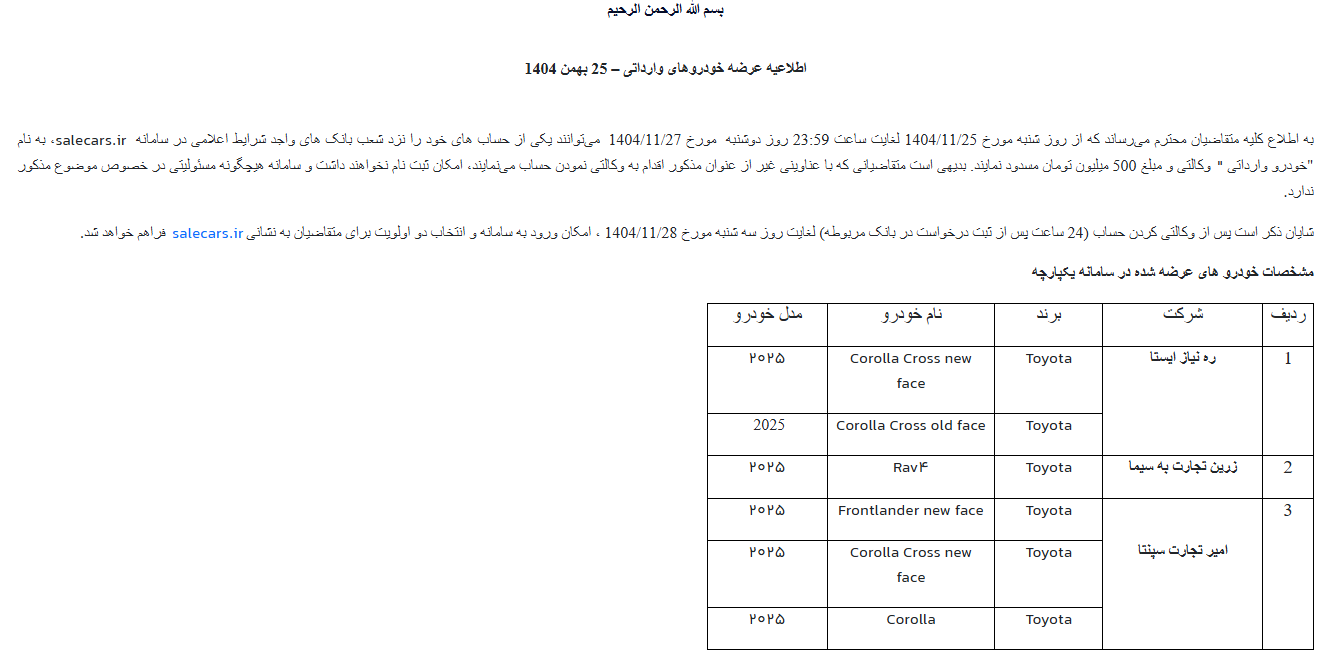 شایان ذکر است، پس از وکالتی شدن حساب (حدود ۲۴ ساعت پس از ثبت درخواست در بانک مربوطه) تا روز سهشنبه ۲۸ بهمن ۱۴۰۴، امکان ورود به سامانه salecars.ir و انتخاب دو اولویت خودرویی برای متقاضیان فراهم خواهد شد.