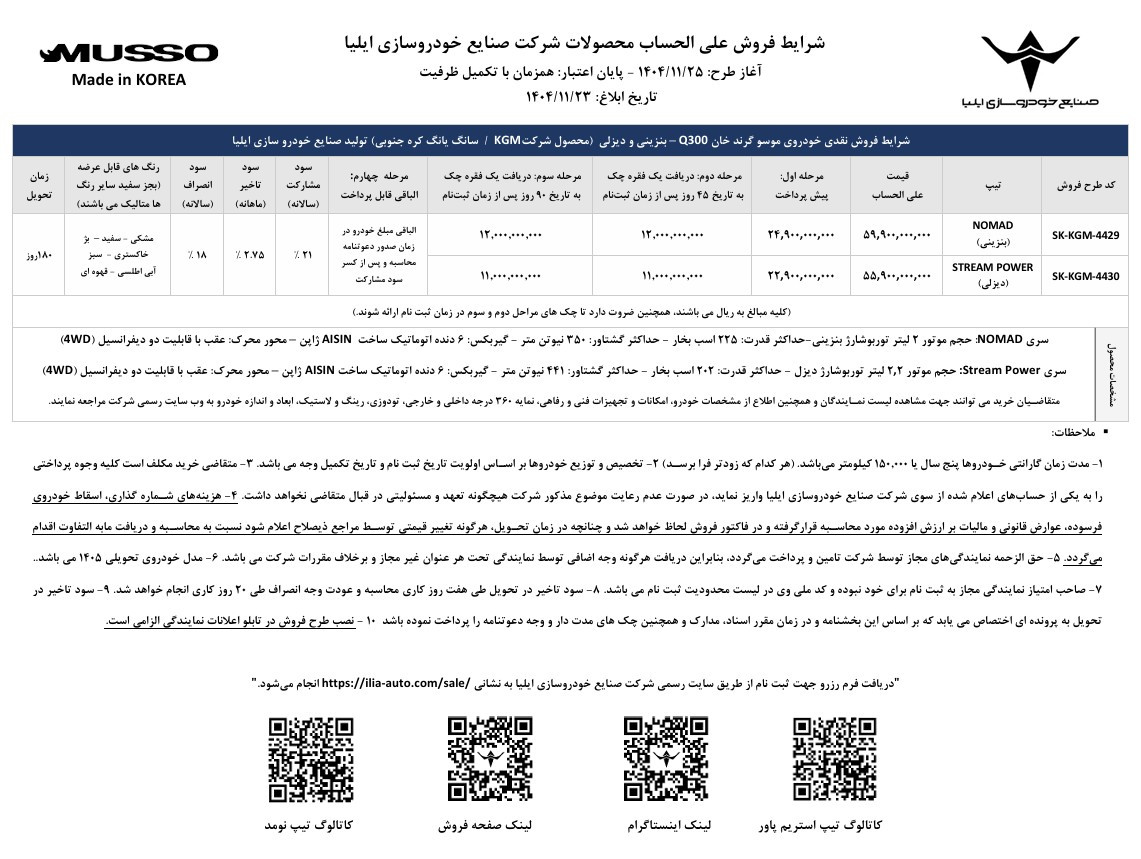 شرکت صنایع خودروسازی ایلیا از آغاز آخرین مرحله فروش (علیالحساب) خودروی موسو گرند Q300 در سال ۱۴۰۴ خبر داد.
