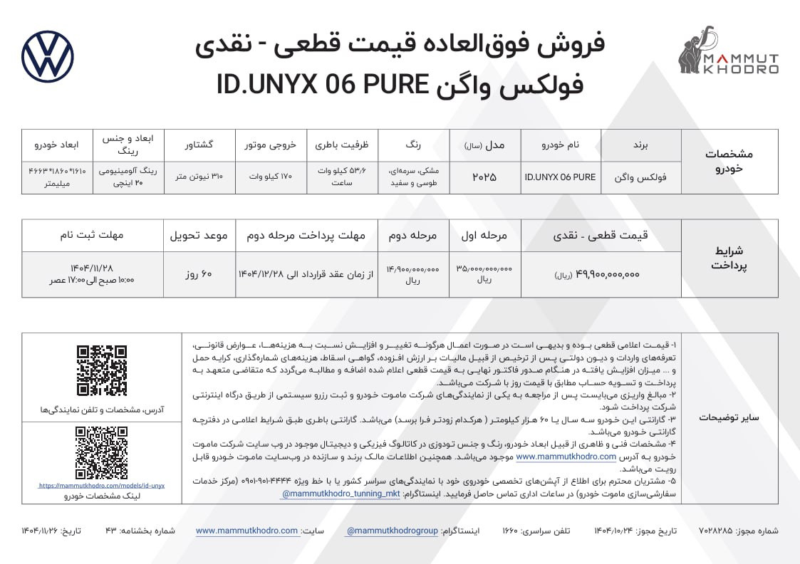 ماموت خودرو به عنوان شرکت عرضهکننده فولکسواگن ID.UNYX از آغاز فروش نسخه «پیور» مدل ۲۰۲۵ خبر داده و اعلام کرده است که این طرح از ساعت 10 صبح سه شنبه 28 بهمن ماه شروع شده و تا ساعت 17 روزی جاری ادامه خواهد داشت.