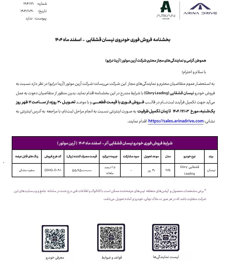 | نیسان قشقایی | 2025 | 5,595,000,000 | 2.5% ماهانه | سفید مشکی | 30 روز |