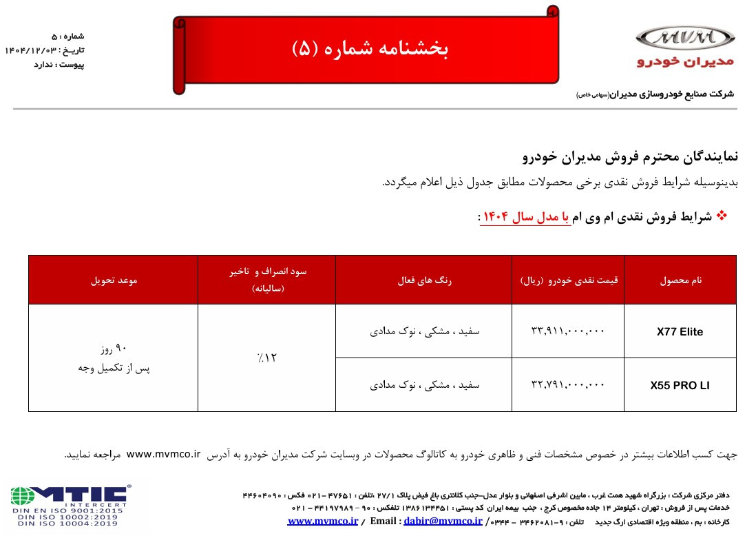 شرکت مدیران خودرو شرایط فروش کراساوور امویام X55 پرو را اعلام کرد. بر اساس اطلاعیه منتشر شده، این طرح فروش با موعد تحویل ۹۰ روزه در اختیار متقاضیان قرار گرفته است.