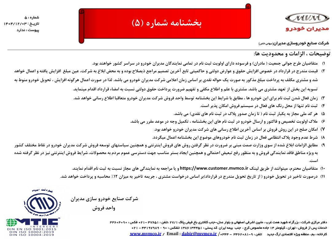 متقاضیان برای خرید این کراساوور میتوانند از ساعت ۱۱:30 امروز، یکشنبه ۳ اسفندماه ۱۴۰۴ با مراجعه حضوری به نمایندگیهای مجاز مدیران خودرو نسبت به ثبتنام اقدام کنند.