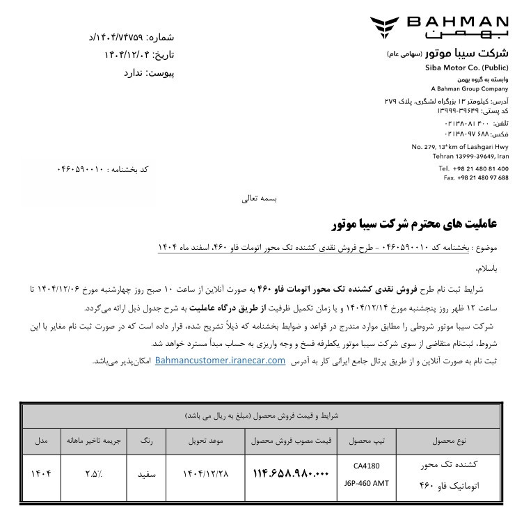 شرکت سیبا موتور شرایط و جزئیات طرح فروش نقدی کشنده تک محور اتومات فاو ۴۶۰ را ویژه اسفند ماه ۱۴۰۴ اعلام کرد. ثبت نام این طرح از ساعت ۱۰ صبح روز چهارشنبه 6 اسفند 1404 آغاز و تا ساعت ۱۲ ظهر روز پنجشنبه 14 اسفند 1404 یا تکمیل ظرفیت ادامه خواهد داشت.