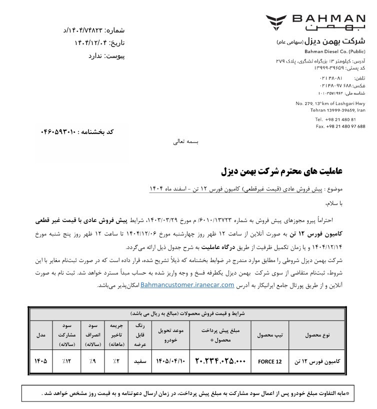 شرکت بهمن دیزل با انتشار اطلاعیه ای، شرایط پیش فروش عادی کامیون فورس 12 تن با قیمت غیرقطعی ویژه اسفند ماه 1404 را اعلام کرد. فروش این محصول از ساعت 12 ظهر چهارشنبه 6 اسفند ماه آغاز و تا ساعت 12 ظهر پنجشنبه 14 اسفند 1404 یا تا زمان تکمیل ظرفیت ادامه خواهد داشت. متقاضیان جهت ثبت سفارش خرید میتوانند به عاملیتهای بهمندیزل مراجعه کنند.